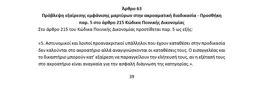 Ειδικότερα στο νομοσχέδιο υπό τον τίτλο «Παρεμβάσεις στον Ποινικό Κώδικα και τον Κώδικα Ποινικής Δικονομίας για την επιτάχυνση και την ποιοτική αναβάθμιση της ποινικής δίκης κλπ», συμπεριελήφθη η ρύθμιση που αφορά την εξαίρεση εμφάνισης μαρτύρων αστυνομικών στην ακροαματική διαδικασία.