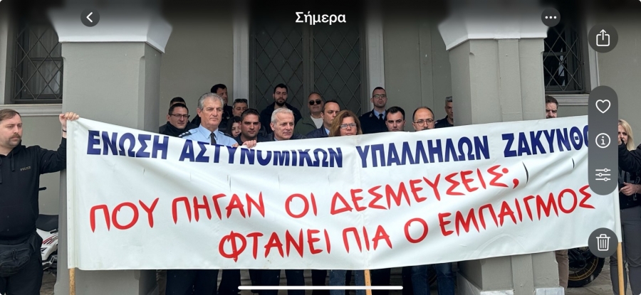 Μετά από πρόσκληση του Προέδρου της Ένωσης Αστυνομικών Υπαλλήλων Ζακύνθου Κώστα ΚΑΡΑΓΚΟΥΝΗ, η Ομοσπονδία, δια του Προέδρου αυτής Γρηγόρη ΓΕΡΑΚΑΡΑΚΟΥ, του Γενικού Γραμματέα Χρήστου ΜΑΥΡΑΓΑΝΗ και του Ταμία Φώτη ΜΑΥΡΑΓΑΝΗ, συμμετείχε στην δυναμική διαμαρτυρία που πραγματοποιήθηκε έξωθεν της Δ.Α. Ζακύνθου με βασικό αίτημα την ενίσχυσή της με αστυνομικό προσωπικό και τα απαραίτητα μέσα.