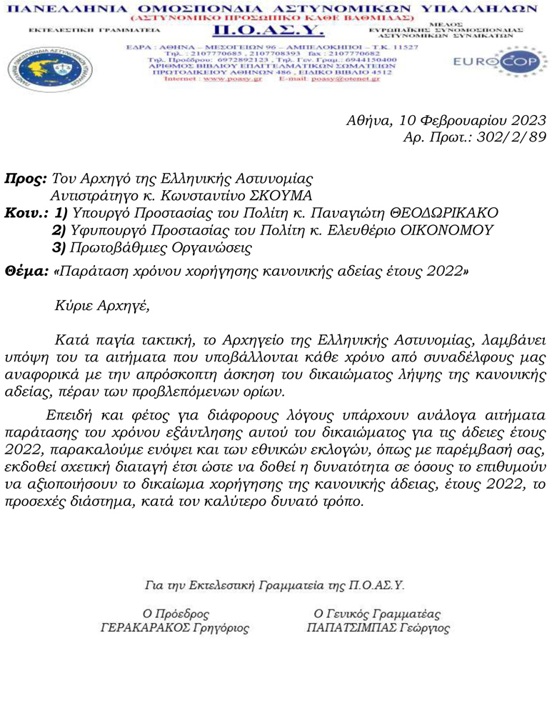 Συνάδελφοι σας κάνουμε γνωστό ότι σε συνέχεια του ανωτέρω σχετικού, εγκρίθηκε η παράταση του χρόνου διάνυσης της κανονικής άδειας, έτους 2022, μέχρι και την 31/10/2023 και παρακαλούμε για την ενημέρωση των μελών σας.