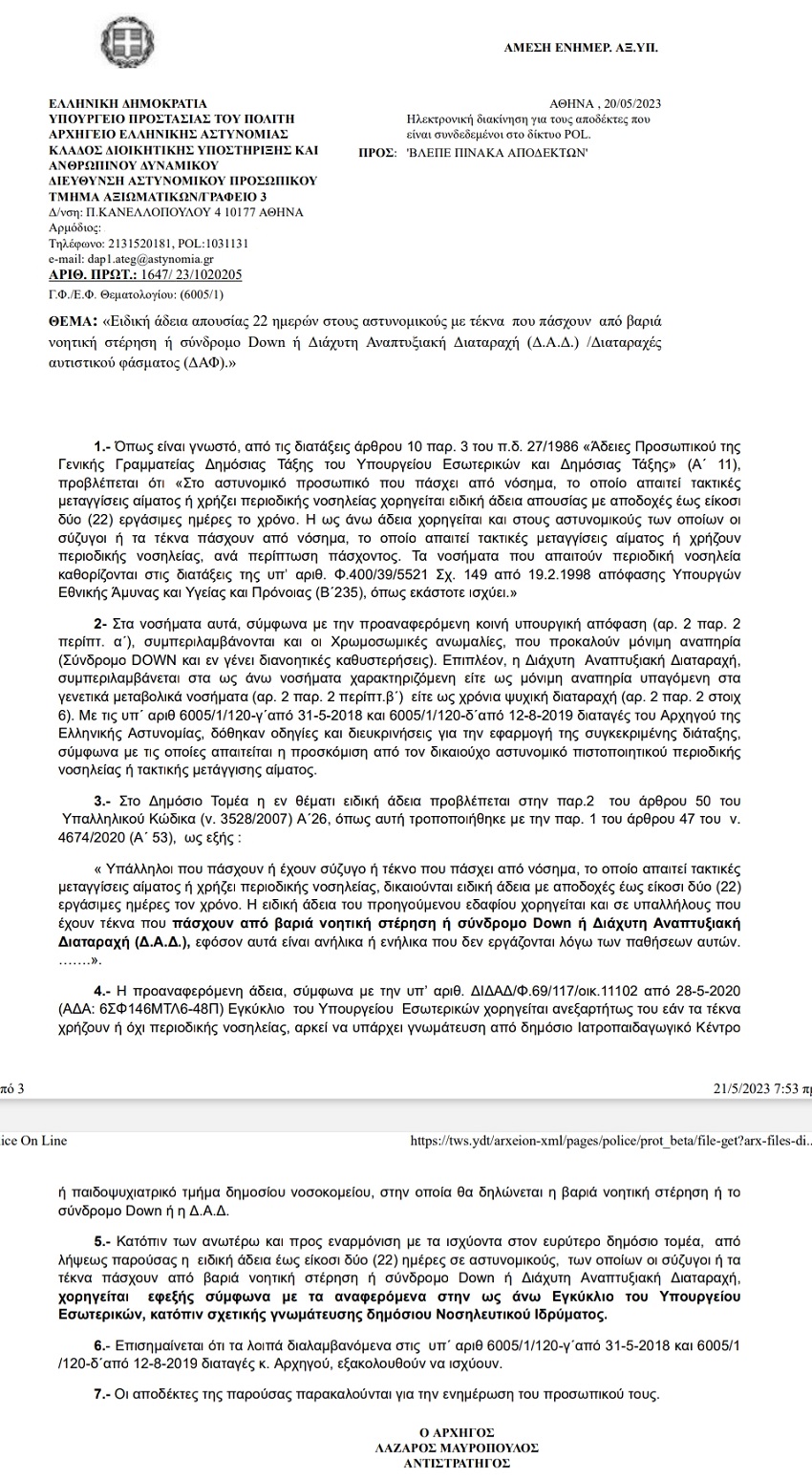 Ειδικότερα, σύμφωνα με την Διαταγή του Αρχηγού της Ελληνικής Αστυνομίας Αντιστρατήγου κ. Λάζαρου ΜΑΥΡΟΠΟΥΛΟΥ (υπ’ αριθμ.: 1647/ 23/ 1020205) που εκδόθηκε στις 20 Μαΐου 2023, η Υπηρεσία, προς εναρμόνιση με τα ισχύοντα στον ευρύτερο δημόσιο τομέα, υποχρεούται στο εξής να χορηγεί και ειδική άδεια έως είκοσι δύο (22) ημέρες, σε αστυνομικούς των οποίων οι σύζυγοι ή τα τέκνα πάσχουν από βαριά νοητική στέρηση ή σύνδρομο Down ή Διάχυτη Αναπτυξιακή Διαταραχή.