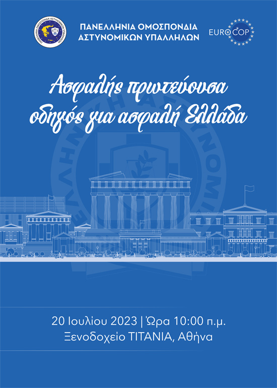Η Πανελλήνια Ομοσπονδία Αστυνομικών Υπαλλήλων, συνεχίζοντας την εξωστρεφή της δράση και αφουγκραζόμενη τον παλμό της κοινωνίας ενόψει και των εκλογών για την ανάδειξη των νέων οργάνων της Αυτοδιοίκησης το φθινόπωρο, διοργανώνει Ημερίδα με θέμα: «Ασφαλής πρωτεύουσα, οδηγός για ασφαλή Ελλάδα», η οποία θα πραγματοποιηθεί στην Αθήνα (Ξενοδοχείο ΤΙΤΑΝΙΑ, Πανεπιστημίου 52) την Πέμπτη 20 Ιουλίου 2023 και ώρα 10:00 π.μ.