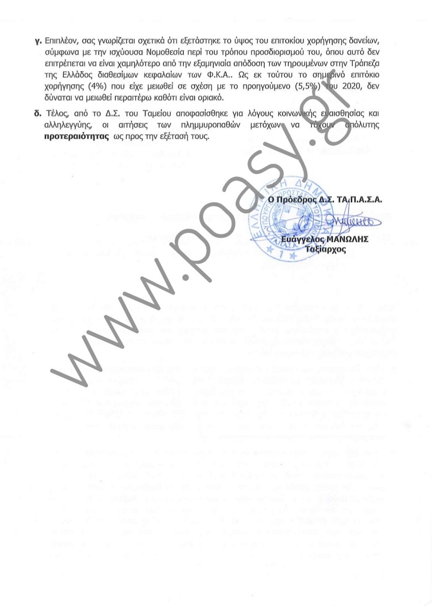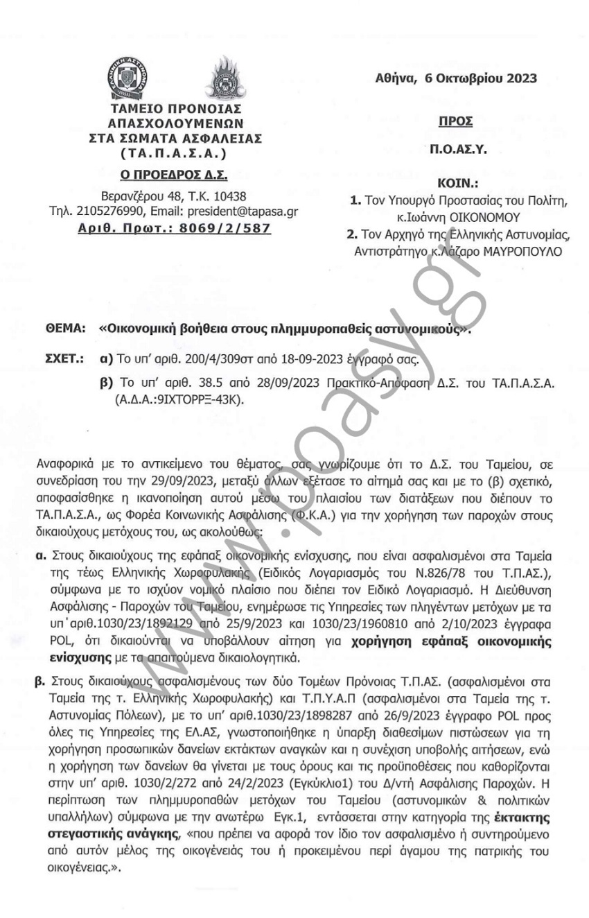 Σας ενημερώνουμε ότι το Διοικητικό Συμβούλιο του ΤΑΠΑΣΑ, σύμφωνα με το σχετικό έγγραφό του (υπ’ αριθμ. 8069/2/587 - 06/10/2023) προς την Ομοσπονδία μας, ανταποκρίθηκε στο αίτημά μας για τη χορήγηση στους πλημμυροπαθείς αστυνομικούς εφάπαξ οικονομικής ενίσχυσης και δανείων εκτάκτων αναγκών.