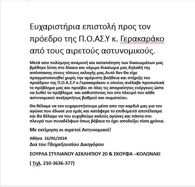 Ενδεικτικά και μόνο αναφέρουμε τη συνάντηση με τον Πρόεδρο της Κεντρικής Ένωσης Δήμων Ελλάδας (ΚΕΔΕ) κ. Λάζαρο ΚΥΡΙΖΟΓΛΟΥ (11 Απριλίου 2024, Αρ. Πρωτ.: 305/8/12), την απόφαση του Διοικητικού μας Συμβουλίου (24 Απριλίου 2024, Αρ. Πρωτ.: 200/2/241α), τη διαβεβαίωση του Υπουργού Προστασίας του Πολίτη προς τον Πρόεδρο της Ομοσπονδίας κ. Γρηγόριο ΓΕΡΑΚΑΡΑΚΟ ότι έχει ξεκινήσει η ικανοποίηση των σχετικών αιτημάτων (26 Απριλίου 2024, Αρ. Πρωτ.: 305/8/13) και τέλος, τη Μηνυτήρια αναφορά κατά του Αρχηγού της Ελληνικής Αστυνομίας (10 Μαΐου 2024 Αρ. Πρωτ.: 305 /8/15) που λειτούργησε καταλυτικά, δίνοντας τέλος σε μια άνευ προηγουμένου παραβίαση των αρχών και των κανόνων της χρηστής διοίκησης.