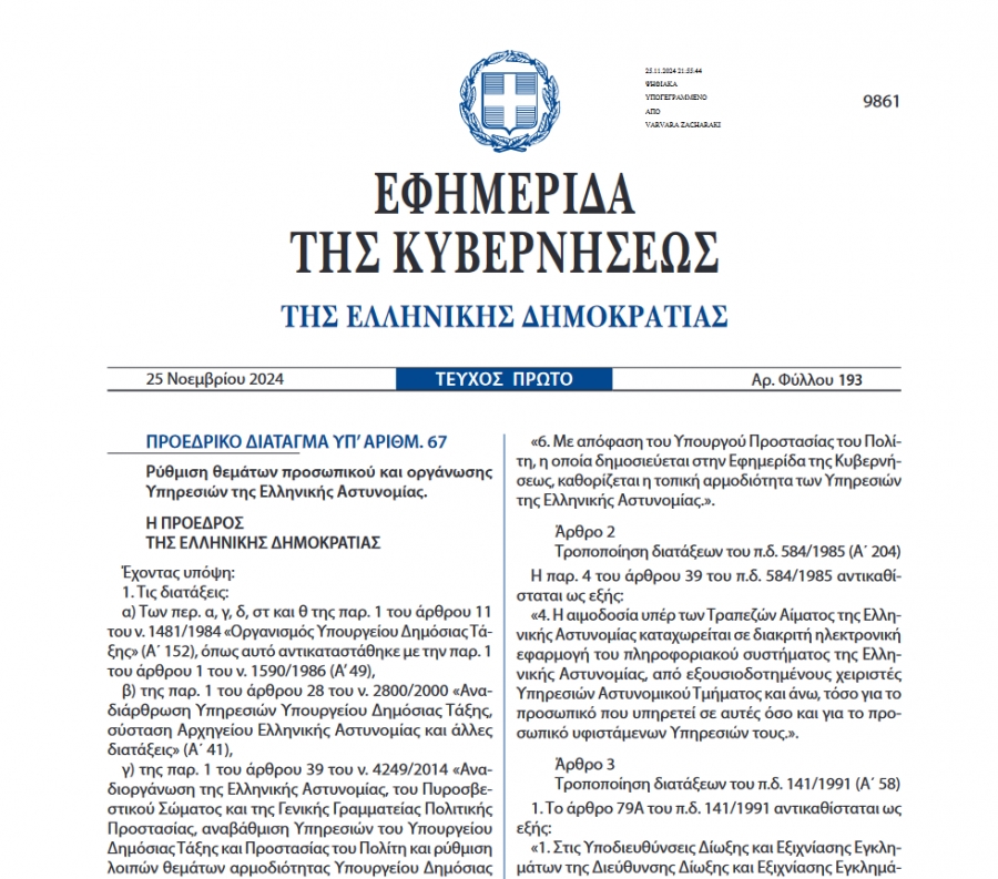 Μετά από πάρα πολύ καιρό και αφού έχουν προηγηθεί ουκ ολίγες παρεμβάσεις μας προς την Πολιτική και Φυσική Ηγεσία, υπεγράφη ένα ακόμα Προεδρικό Διάταγμα 67/2024 (ΦΕΚ 193, 25/11/2024) που αφορά τη Ρύθμιση θεμάτων προσωπικού και οργάνωσης Υπηρεσιών της Ελληνικής Αστυνομίας, ικανοποιώντας, επιτέλους, σημαντικά αιτήματά μας.