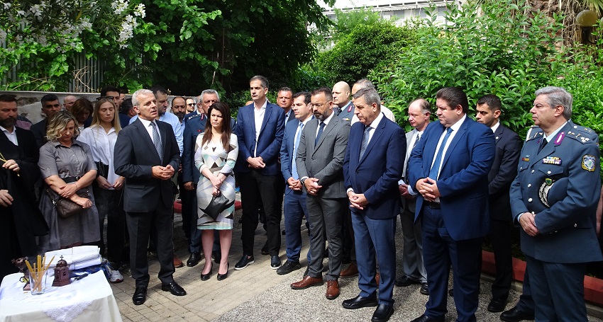 Στη συνέχεια πήρε το λόγο ο Υπηρεσιακός Υπουργός Προστασίας του Πολίτη κ. Χαράλαμπος ΛΑΛΟΥΣΗΣ, ο οποίος τόνισε ότι ως πολιτεία, έχουμε χρέος να είμαστε εδώ και πρόσθεσε: Είμαστε υπερήφανοι για τους ήρωες αστυνομικούς, βέβαια μας λείπουν, λείπουν από την οικογένειά τους - η απώλεια του ανθρώπου είναι δυσαναπλήρωτη - αλλά η παρακαταθήκη τους είναι η περηφάνια που νιώθετε εσείς, όπως και όλοι εμείς. Ξεπέρασαν τον εαυτό τους με την θυσία τους, τους τιμούμε και δεν τους λησμονούμε. Στη συνέχεια, αφού αναφέρθηκε στο σημαντικό και αδιάκοπο έργο της αστυνομίας για την ασφάλεια των πολιτών, καταγράφοντας μεγάλο αριθμό θυμάτων και τραυματιών, ανακοίνωσε ότι έχει προτείνει την ανέγερση ενός μνημείου με όλα τα ονόματα των πεσόντων αστυνομικών, από το 1984 και εντεύθεν, ευχόμενος να μην υπάρξουν άλλα θύματα.