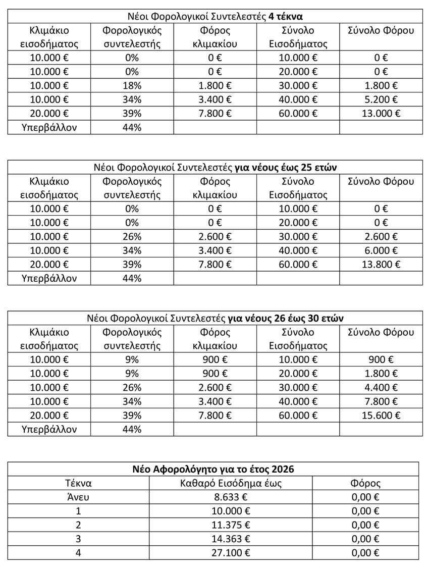 Β) Η μείωση από τον Ιανουάριο του 2026 κατά 2% των συντελεστών της κλίμακας φορολογίας, έρχεται να τονώσει τον οικογενειακό προϋπολογισμό, ιδίως των πολυτέκνων οικογενειών, όπου παρατηρείται μεγαλύτερη φοροαπαλλαγή, καθώς και των νέων κυρίως συναδέλφων, ανάλογα την ηλικία τους (έως 25 και 30 ετών).