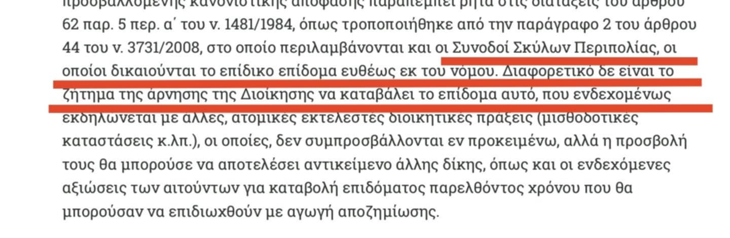 Σε συνέχεια του υπ’ αριθμ. 309/8/3α από 11/03/2025 εγγράφου μας με αντικείμενο τη λήψη νομοθετικών πρωτοβουλιών για την αποτελεσματικότερη λειτουργία της Ομάδας αστυνομικών σκύλων και την ικανοποίηση των αιτημάτων των συναδέλφων μας, σας καλούμε να λάβετε υπόψη σας και το γεγονός ότι σύμφωνα με την 2471/2023 Απόφαση του Συμβουλίου της Επικρατείας, οι Συνοδοί Σκύλων Περιπολίας είναι ήδη δικαιούχοι του επιδόματος κινδύνου, βάσει του άρθρου 8 παρ. 2 της Κοινής Υπουργικής Απόφασης 8002/1/520-γ΄/15.3.2018.