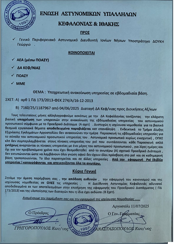 Η Ένωση Αστυνομικών Υπαλλήλων Κεφαλληνίας και Ιθάκης, με το επισυναπτόμενο έγγραφό της προς τον Γενικό Περιφερειακό Αστυνομικό Διευθυντή Ιονίων Νήσων Υποστράτηγο κ. Γεώργιο ΔΟΥΚΗ, διαμαρτύρεται εντόνως για την παραβίαση του Προεδρικού Διατάγματος 173/2013 το οποίο αφορά την εβδομαδιαία υπηρεσία του αστυνομικού προσωπικού.