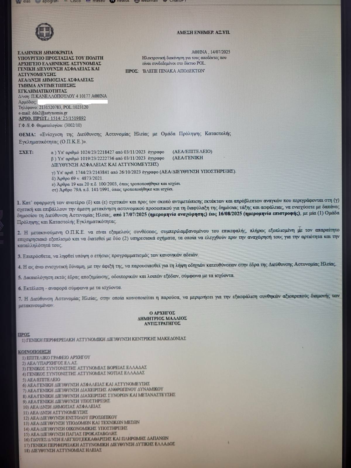 Κοιν.:1)Γενικό Συντονιστή Αστυνομίας Βορείου Ελλάδος, Αντιστράτηγο κ. Γεώργιο ΠΑΠΑΔΟΠΟΥΛΟ